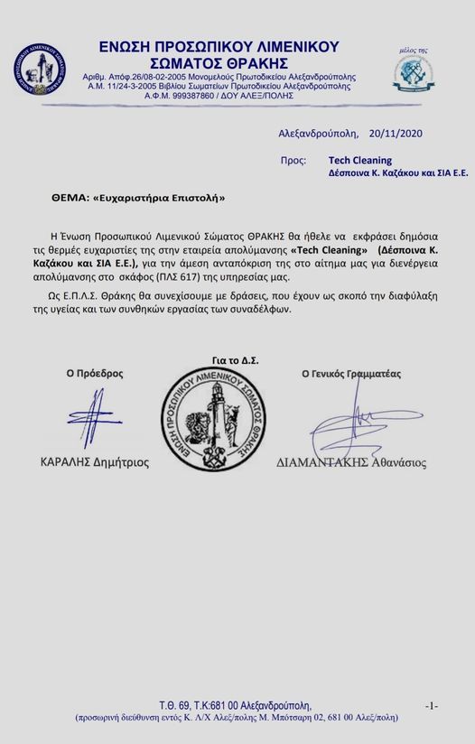 - Την Ένωση Προσωπικού Λιμενικού Σώματος Θράκης με παροχή δωρεάν υπηρεσιών απολύμανσης.